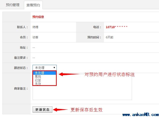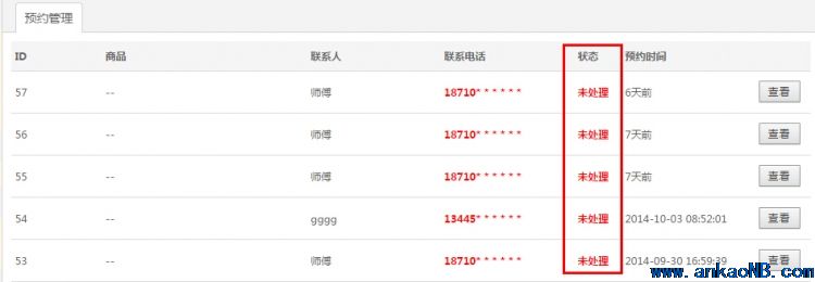 2、商家或者酒店在用戶中心查看預約用戶信息(默認狀態(tài)下,全部顯示為未處理狀態(tài)),并且進行電話或者QQ跟蹤了解用戶;