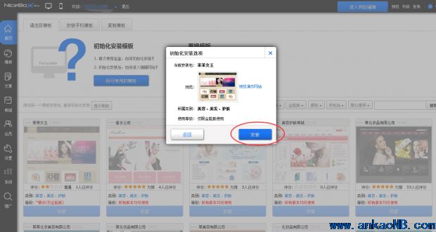 走到這一步,建站過程基本上就完成了一半,進(jìn)入你的網(wǎng)站后臺,首先第一步就要在建站寶盒提供的上千套網(wǎng)站模板中挑選一套你中意的模板了,模板提供預(yù)覽功能,看重之后,點(diǎn)擊模板下方的“安裝”鍵,開始安裝。