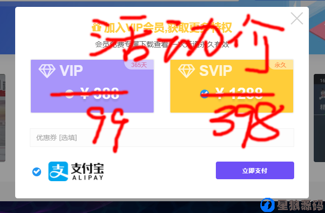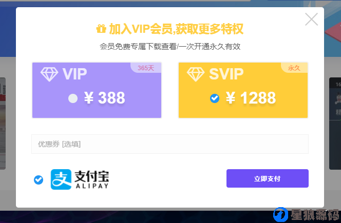 開(kāi)通VIP之后可以享受本站優(yōu)質(zhì)資源和免積分下載權(quán)限,商城的資源目前對(duì)年費(fèi)會(huì)員和永久會(huì)員全面開(kāi)放,可以下載星狼源碼里的所有資源。注意:年費(fèi)會(huì)員只享受VIP標(biāo)志的資源,部分SVIP資源不能下載。