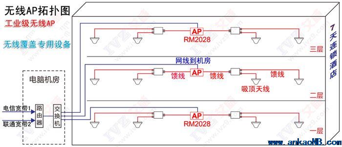 AP和吸頂天線安裝在樓道,施工簡單,無線信號穿透到樓道兩邊的房間,不用對每個(gè)房間進(jìn)行施工,也避免了設(shè)備裝在客房容易損壞。整個(gè)方案設(shè)備少,故障點(diǎn)少,運(yùn)行穩(wěn)定,安裝調(diào)試好后常年不用維護(hù)。如圖所示: