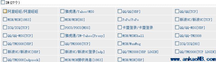 | IM控制 | 可分組、分用戶、分時段封堵所有聊天軟件如:QQ、MSN、新浪UC、Yahoo Messenger、網(wǎng)易泡泡、Skype、飛信等 | |