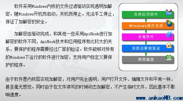 安靠加密軟件采用Windows內(nèi)核的文件過濾驅(qū)動實現(xiàn)透明加解密。隨Windows開機而啟動,關(guān)機而停止。無法手工停止,保證了加解密的安全。