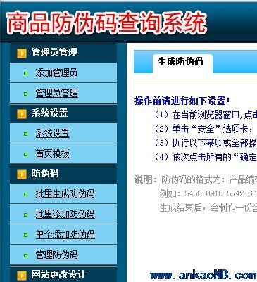 系統(tǒng)原理:1.后臺(tái)批量生成防偽碼 2.導(dǎo)出防偽碼 3.印刷防偽碼 4.把防偽碼貼在產(chǎn)品上 5.用戶購買后登陸網(wǎng)站查詢真?zhèn)危?br />