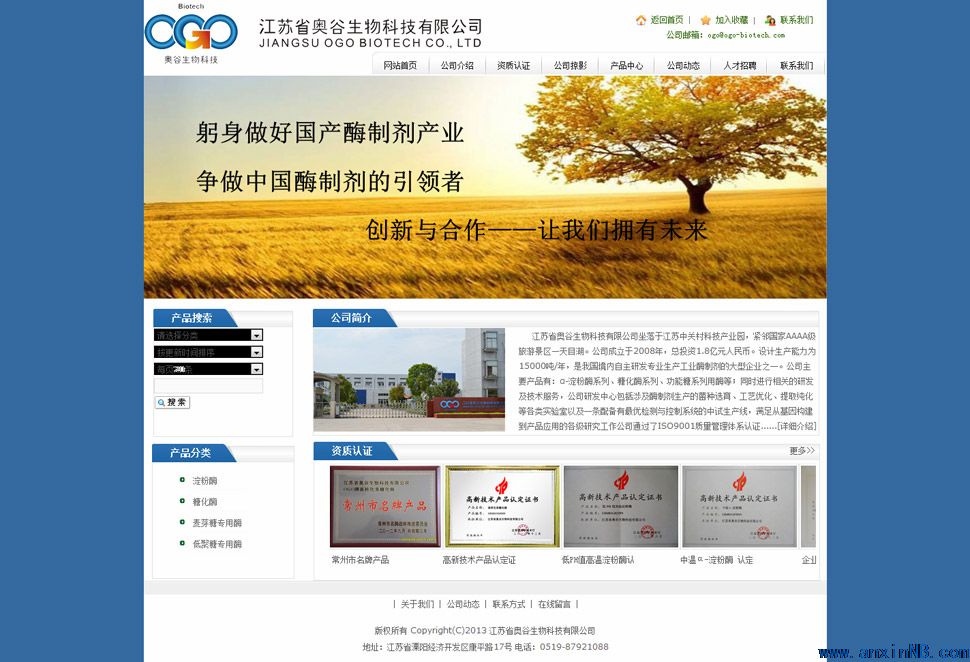 江蘇省奧谷生物科技有限公司坐落于江蘇中關(guān)村科技產(chǎn)業(yè)園,緊鄰國家AAAA級(jí)旅游景區(qū)—天目湖。公司成立于2008年,總投資1.8億元人民幣。設(shè)計(jì)生產(chǎn)能力為15000噸/年,是我國境內(nèi)自主研發(fā)專業(yè)生產(chǎn)工業(yè)酶制劑的大型企業(yè)之一。